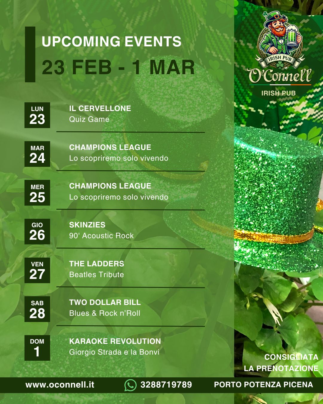 All'O'Connell Irish Pub ogni serata è speciale: musica live, giochi e l'energia contagiosa che solo un pub irlandese può regalare. Che tu sia un appassionato di sport, un amante della musica folk o semplicemente alla ricerca di un luogo accogliente per rilassarti, qui troverai sempre un sorriso e un posto a tavola.