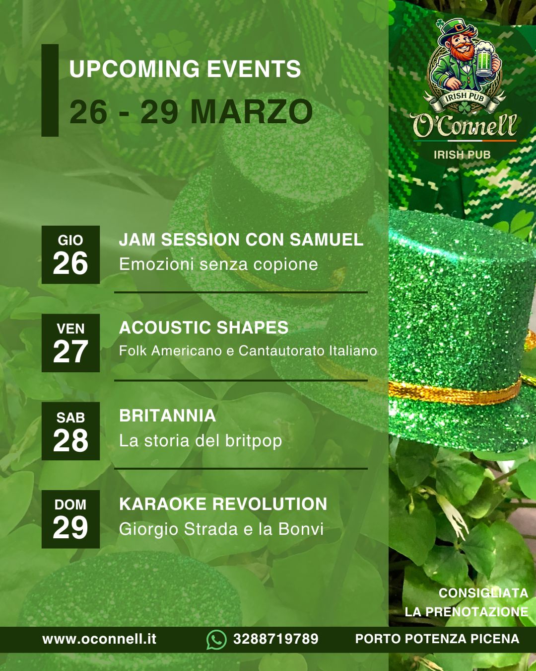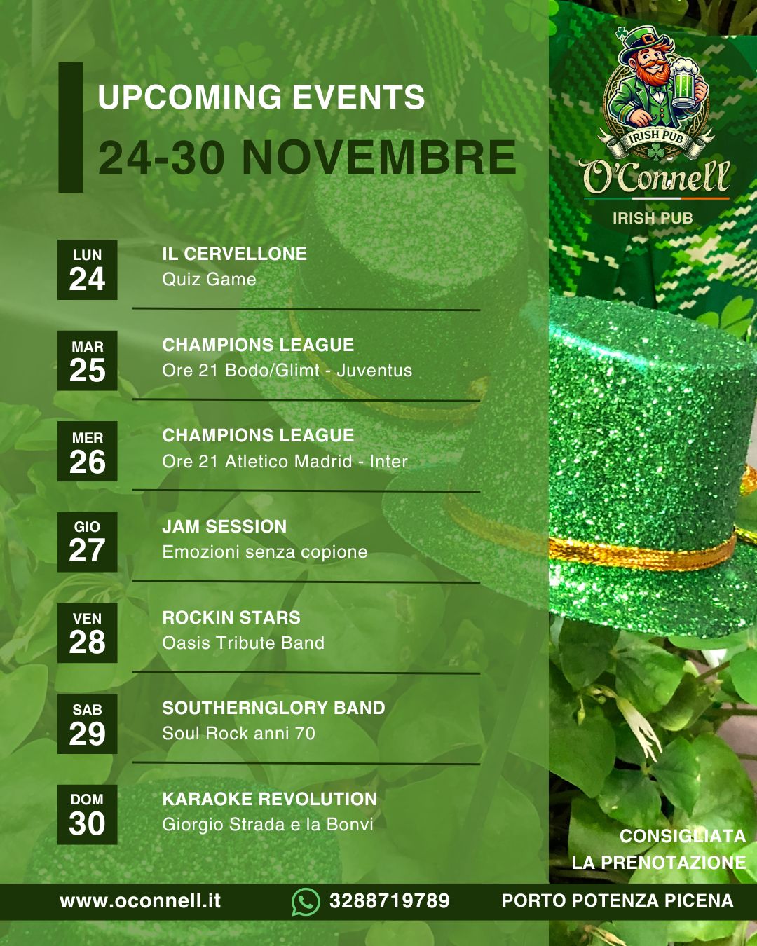 All'O'Connell Irish Pub ogni serata è speciale: musica live, giochi e l'energia contagiosa che solo un pub irlandese può regalare. Che tu sia un appassionato di sport, un amante della musica folk o semplicemente alla ricerca di un luogo accogliente per rilassarti, qui troverai sempre un sorriso e un posto a tavola.